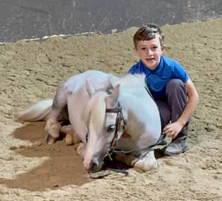 Meet Marshmallow, a 7-year-old, 35” grey pinto miniature gelding with a personality as sweet as his name. He’s the ultimate family companion—flashy, well-trained, and packed with fun!