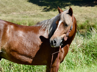 This handsome pony will be offered as a finished driving pony, and he truly shines in the cart. He is well broke to drive, dependable, and knows all the tricks—including laying down on cue, sitting up from the lay-down, and even sitting on a bean bag—making him a fun and flashy partner. While he is also broke to ride, he came to us as a little cowboy’s pony and has had a rope thrown off him, so he’s got some pep and “go” under saddle. Because he is a bit too much horse for the smaller kids we have here, we will not be riding him while he is with us, and he will be sold strictly as a driving pony unless an experienced youth rider wishes to continue his saddle training. In the harness, however, he is solid, seasoned, and ready to go to work for his next person.